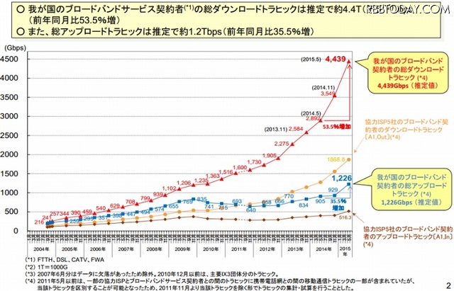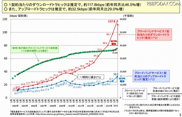 それによると、2015年5月のブロードバンドサービス契約者の総ダウンロードトラヒックは、推定で約4.4Tbpsで、前年の約2.9Tbpsから53.5%増となった。総アップロードトラヒックは、推定で約1.2Tbpsで、前年の約905Gbpsから35.5%増となっている。この増加率は昨年を上回るもので、日本のブロードバンド利用が、まだまだ拡大している現状が明らかとなった。背景にはスマホや動画サービスの普及があるとみられる。