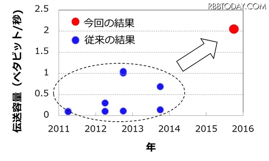 データ伝送に必要な信号帯域を極限まで狭くする「スーパーナイキスト波長多重伝送技術」で、360波長に多重した。さらに「マルチコア・マルチモード光ファイバ」により、1本の光ファイバ内に6つの異なる伝搬モードと19個のコアにより114の空間多重を行った。これにより、2Pbpsを達成した。なお、この伝送容量は商用の光ファイバシステム(太平洋横断海底ケーブルシステムFASTER)と比べると、約200倍となる。