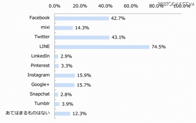 まず「現在、使っているSNSサービス」を聞くと、「LINE」74.5%がトップで、以下「Twitter」43.1%、「Facebook」42.7%、「Instagram」15.9%が続いた。このうちLINEについて、年代別で3月時点と比較すると、30代・40代・50代で利用率が伸びており、とくに50代は57.9%から67.9%まで上昇し、40代の65.0%を上回っていた。