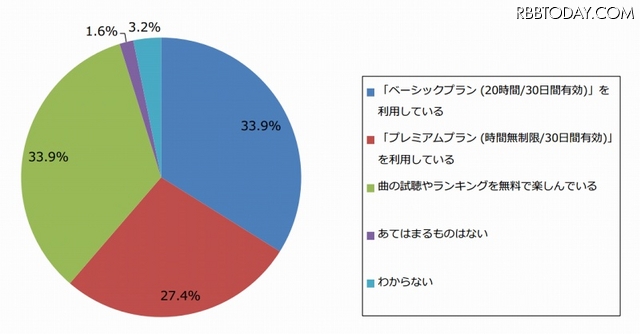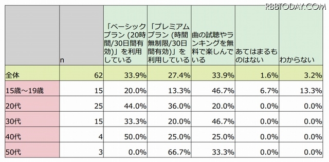 LINE周辺サービスでは、「LINE MUSIC」利用者の33.9%が「ベーシックプラン(500円/20時間)」、27.4%が「プレミアムプラン(1000円/時間無制限)」を申し込んでいた。合計61.3%が有償プランを利用していることとなる。年代別で見ると、20代は80.0%が有償プランを利用していた。