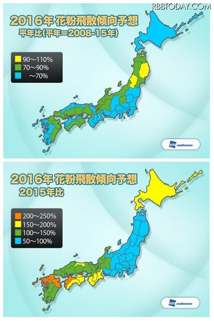 なお、花粉の飛散は多い年と少ない年が交互にやってくることが多く、花粉が多く飛散する“表年”の翌年は、飛散量が減少する“裏年”となる傾向がある。2016年は、北海道や西日本は“表年”となり、東北や東日本は“裏年”となるという。