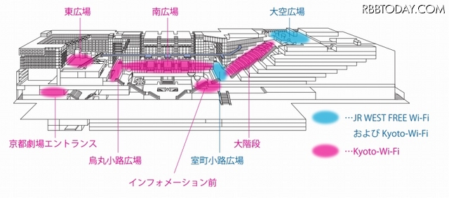 西日本旅客鉄道(JR西日本)は8日、京都駅ビルの公共スペース全域で、無料公衆無線LANサービスの提供を行うことを発表した。23日から、京都市が展開するWi-Fiサービス「KYOTO Wi-Fi」の利用が可能になる。