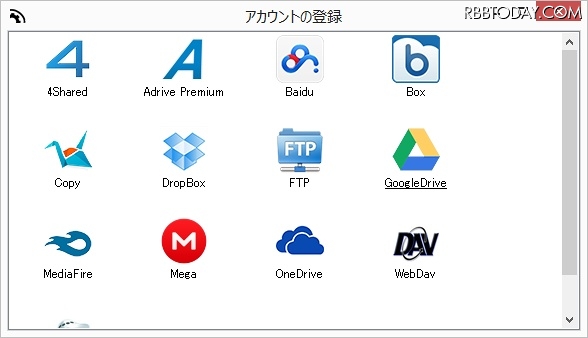 「まとめてクラウド」では、クラウドサービスの登録済みアカウントを設定することで、専用ソフトやWebページを開くことなく、一元的にデータ管理が可能になる。対応するクラウドサービスは、Googleドライブ、Box、OneDrive、Dropbox、MEGA、Copy、Mediafire、Yandex、WebDAV、Baidu、4shared(10月現在)。同一クラウドサービス上で、異なる複数アカウントを持つ場合にも対応する。