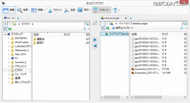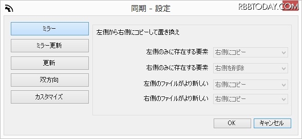 また各クラウドの同期方法として「ミラー」「ミラー更新」「更新」「双方向」の4つを用意し、元データの保管や日付比較などに基づいたコピーが行えるようになっている。