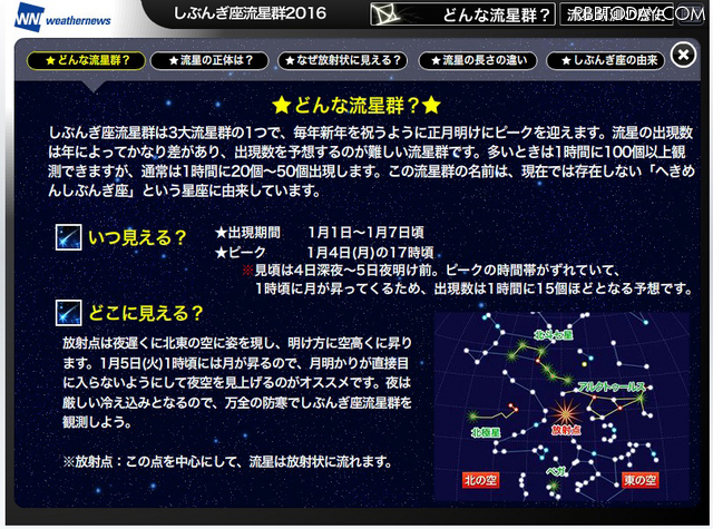 ウェザーニューズは4日の天候について、高気圧圏内のため、関東や東海、近畿などは星空を観測できる場所が多くなるものの、北陸から北のエリアの日本海側では、寒気の影響によって流星観測が難しいと予想。また今回は、多い時で1時間に15個程度の出現になるという。