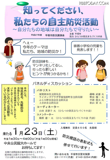 また、同講演会では、2016年度平塚市防災標語の表彰式と、崇善小学校の児童による防災活動の発表も併せて行われる。日時は23日13時30分~16時、場所は平塚市中央公民館大ホール。定員は先着順で650名。