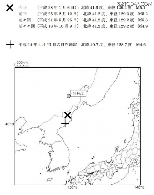 北緯41.6度・東経129.2度の地点において、マグニチュード5.1の地震波を観測。深さは0kmと見られている。