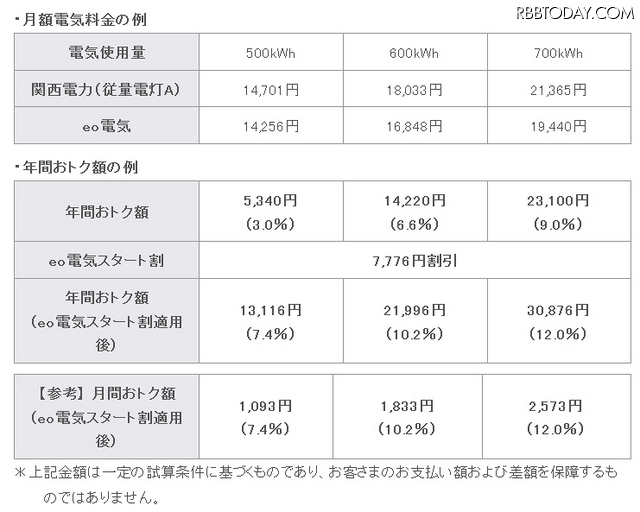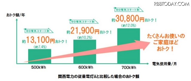「eo電気」の料金プランは、電気使用量が多い家庭ほど、割引率が上昇するのが特徴とのこと。たとえば関西電力(従量電灯A)で、1カ月500kWhを利用している場合、「eo電気」ではキャンペーン適用で年間約13,100円の割引になるという。