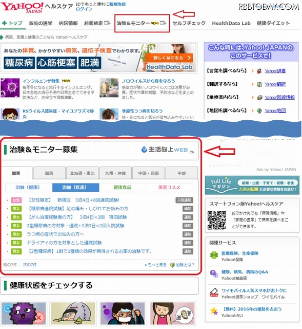 ヤフーとクリニカル・トライアルは12日、臨床試験(治験)に関する情報連携を開始した。「Yahoo!ヘルスケア」に、「生活向上WEB」の治験募集情報などを掲載する。