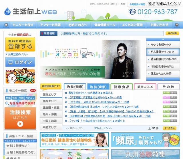 「生活向上WEB」は、生活者向けに治験関連コンテンツを提供しているサイト。今回「生活向上WEB」の一部を「Yahoo!ヘルスケア」に新設する「治験&モニター」ページに掲載する。これにより「Yahoo!ヘルスケア」は、国内の健康情報系ポータルサイトとして初めて、治験情報を定常的に掲載することとなる。