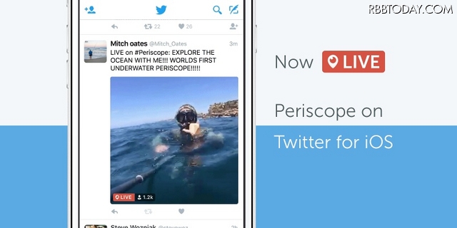 Twitterは12日、同社のライブ配信アプリ「Periscope」(ペリスコープ)に対応した。サービス機能の統合を行い、Periscopeの中継を、直接Twitter内で視聴可能とした。