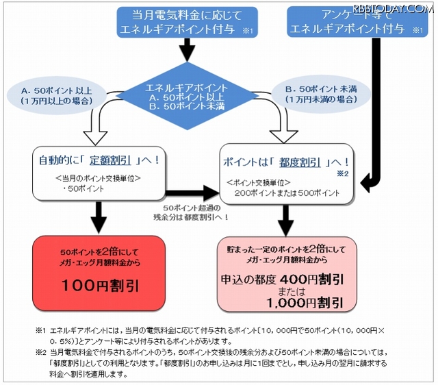 「メガ・エッグ でんき割メニュー」は、「コラボレーションメニュー」の1つとして、エネコムが提供するものだ。エネルギアポイントと同一数のポイントを、使用時にエネコムが追加することで、ポイント2倍相当がエネコムのインターネットサービス「メガ・エッグ」の月額料金から割り引かれる。