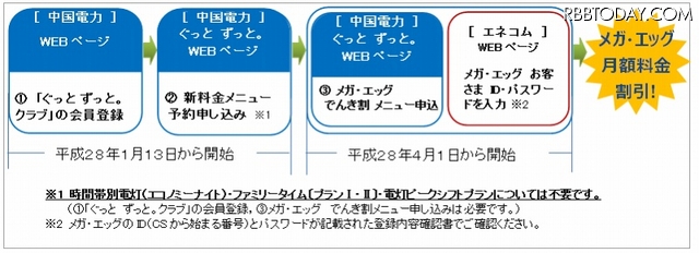 中国電力が運営するWebページ「ぐっと ずっと。Web」内から申し込みが可能。利用には、中国電力のエネルギアポイントサービスの対象となる電気料金メニューの契約に加えて、Web会員「ぐっと ずっと。クラブ」に加入したうえ、「メガ・エッグ でんき割メニュー」へ申し込む必要がある。