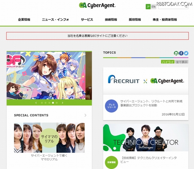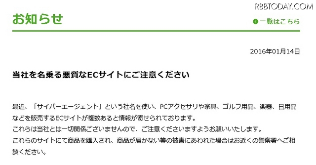サイバーエージェントは14日、同社を騙るECサイトが存在するとして注意を呼びかけた。