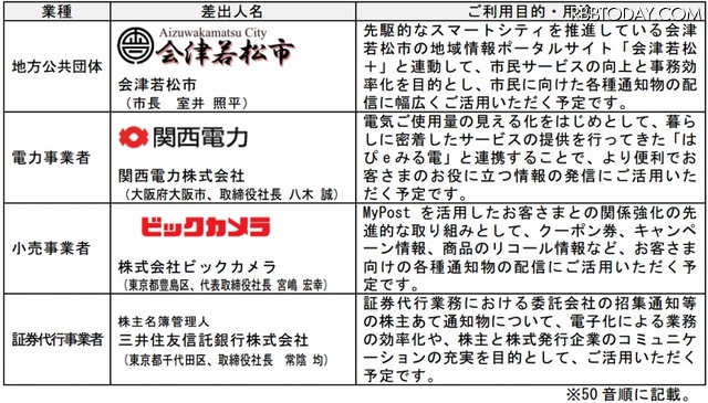 試行提供では、会津若松市、関西電力、ビックカメラ、三井住友信託銀行が、利用をスタート。会員に対し、重要書類をはじめとしたさまざまな電子データ(レター)の配信を行う。今後は、企業・官公庁に対する各種手続機能などが拡張される予定だ。