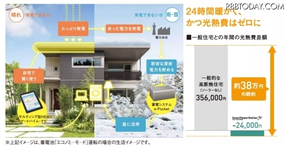 同社がすでに提供している住宅「スマートパワーステーション」の積雪地域向けという位置付け。太陽光発電と大容量リチウムイオン蓄電池にホームエネルギーマネジメントシステム(HEMS)を組み合わせて、電力以外のエネルギーを必要としない「ゼロエネルギー住宅」というコンセプトだ。
