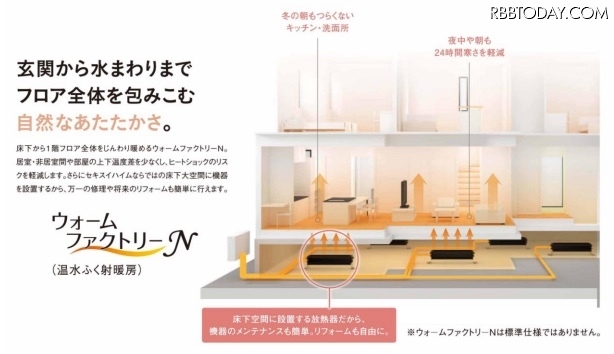 また、オプションになるが、寒冷地仕様の温水ヒートポンプ式床下輻射暖房システム「ウォームファクトリーN」では、1階フロア全体を輻射熱で暖めるので、例えば玄関、廊下やお風呂の脱衣所などの非居室もじんわりと暖め、冬場の脱衣所などで起きがちな温度差による「ヒートショック」を防いでくれる。ほかにも蓄電池を備えているため、電気料金が安い深夜に電力を溜め込むことでの電気代の節約をしたり、太陽光発電を組み合わせ、余った電力を電力会社に売電することで、年間で通してみれば「光熱費ゼロ」を実現することも可能だという。