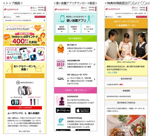 これら4つのサービス(12種類のアプリケーション)のほか、ABCクッキングスタジオの入会金無料クーポン、オムロンヘルスケアの体重体組成計の割引など、健康に役立つ商品・サービスの特典も提供される。