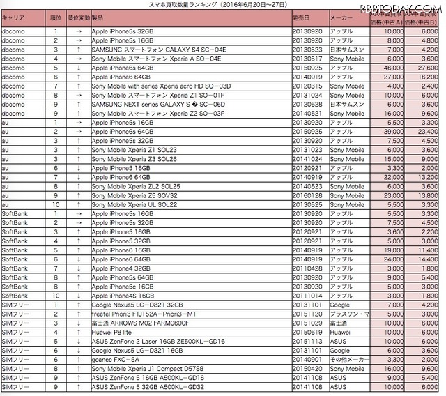 ソフトバンクでは1位から10位までをiPhoneが独占。下位ながら、他キャリアに先駆けてiPhone 6もランクインしており、その値動きにも注目が集まる。ちなみに現在、中古Aの販売価格では9位のiPhone 6 64GBが43,800円、10位のiPhone 6 16GBが39,800円だ。