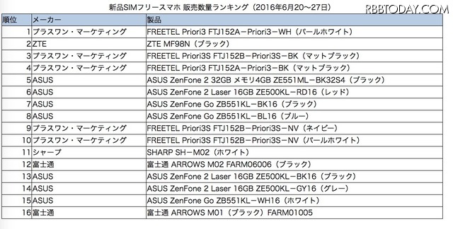 また、ゲオモバイルでは格安SIMサービスとのセットで新品のSIMフリー端末も販売している。上位三傑はプラスワン・マーケティングの「FREETEL Priori3 FTJ152A-WH(パールホワイト)」、「ZTE MF98N(ブラック)」、「FREETEL Priori3 FTJ152B-BK(マットブラック)」だった。ランキングの上位にはFREETEL以外にもシャープや富士通といった日本メーカーの姿が確認できる。海外メーカーの躍進により影を潜めた感のある日本メーカーだが、ミドルレンジのスマートフォン市場に活路を見出すことはできるだろうか。