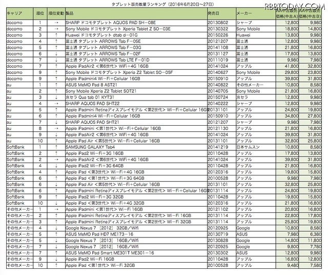 auでは第1位が「京セラ Qua tab 01 KYT31」、第2位が「Huawei Qua tab 02 HWT31」、第3位が「Apple iPadAir2 <第6世代> Wi-Fi+4G 16GB」、第4位が「Apple iPad mini Retinaディスプレイモデル <第2世代> Wi-Fi+Cellular 16GB」、第5位が「Apple iPad mini4 Wi-Fi+Cellular 16GB」となっている。