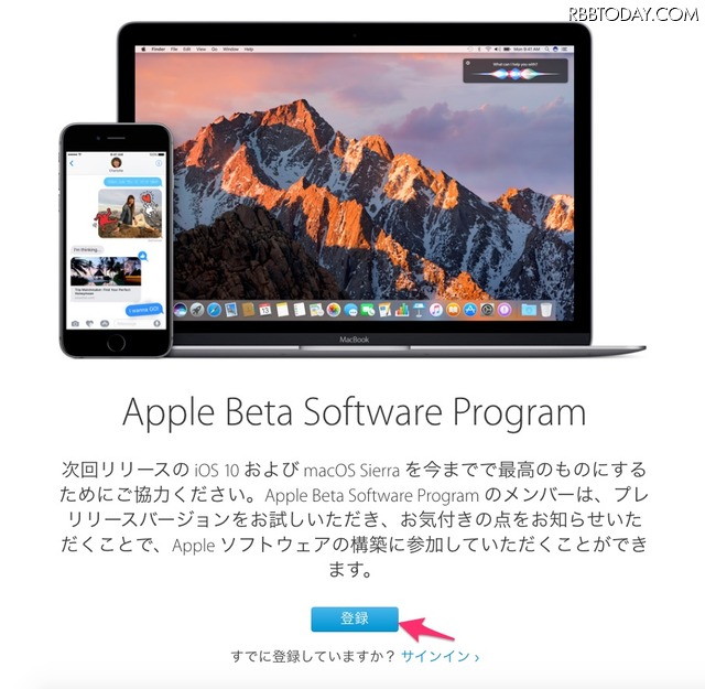 「Apple Beta Software Program」には登録が必要だが、難しいことはない。同プログラムのトップページから「登録」を選択。その後、遷移先のページでApple IDとパスワードを入力してサインイン。完了すれば、今回ダウンロード、インストールを行うデバイスを選択する。