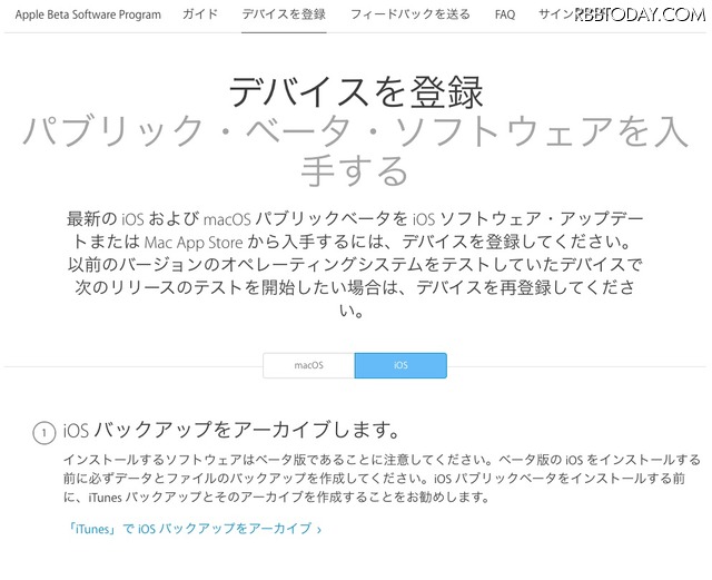 ここまでの登録作業はPC環境でも良かったが、ここから先は、「iOS10 Public beta 1」を実際にインストールする端末から実行する。ただ、「ベータ版」では何が起きるかわからないので、万が一に備えてiTunesにバックアップをとっておくことを強くおすすめする。