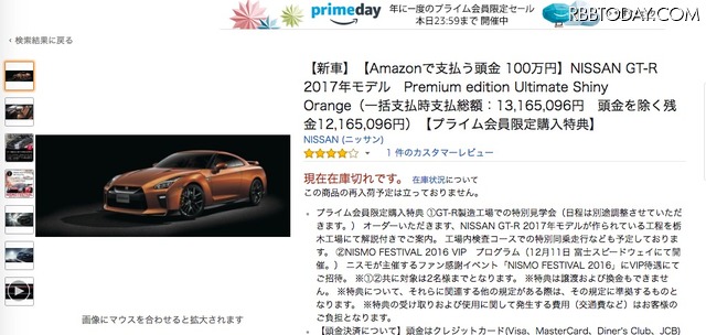 同車は、27日発売のGT-Rシリーズ最新車種。PrimeDay 2016での購入特典として、GT-R製造工場での特別見学会や、ニスモが主催するファン感謝イベント「NISMO FESTIVAL 2016」にVIP待遇にて招待される権利などが付くわけだが、その販売価格は1,000万円超え(車両本体価格:税込11,705,040円、支払総額:13,165,096円)。カートでは100万円の頭金のみ支払い、後ほど残金12,165,096円の支払い案内が来るそうだが、高級スポーツカーがAmazonでポチッとできる時代が来たというのはある種、画期的である。