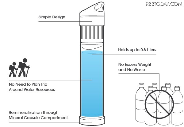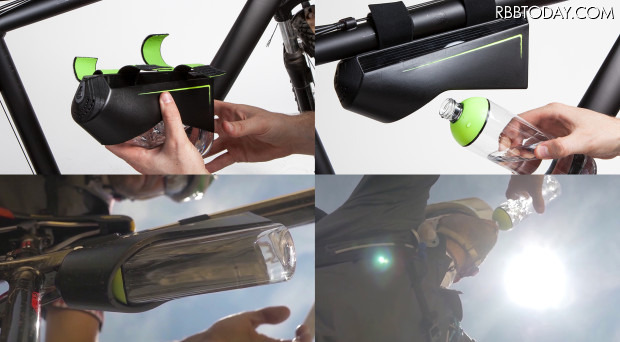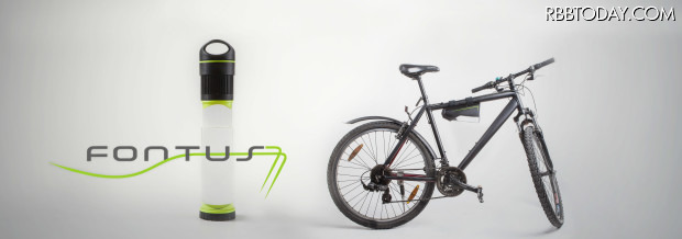 「Fontus」シリーズは2種類展開されているが、まず「Fontus Ryde」は自転車に取り付けるタイプのデバイスで、自転車の速度を利用して、空気を内部に取り込む。自転車にボトルを取り付けるための専用ケースには、小型のソーラーパネルが搭載されているので、冷却する際、一切の人工エネルギーを必要としない。1時間の走行で、約500mlの飲料水の生成が可能だという。