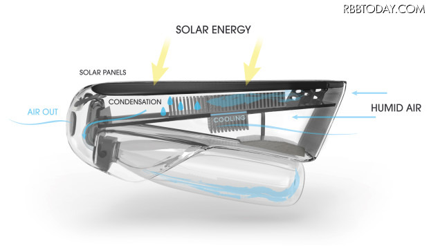 空気中の水分から飲料水を生成すると聞くと難しく感じるかもしれないが、アイデア自体は非常にシンプル。湿った空気を本体内部に取り入れ、冷却によって結露した水分のみを集めるといった形だ。