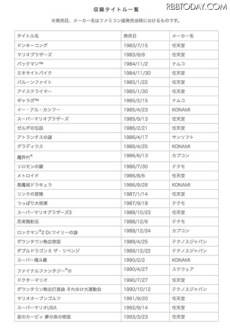任天堂は30日、1983年に発売された家庭用ゲーム機「ファミリーコンピュータ(以下、ファミコン)」の本体サイズを約60%に縮小し、あらかじめ収録された往年の30タイトルをカセットの交換なしに楽しめる家庭用ゲーム機「ニンテンドークラシックミニ ファミリーコンピュータ」を、11月10日に発売すると発表した。価格は、5,980円(税抜)。