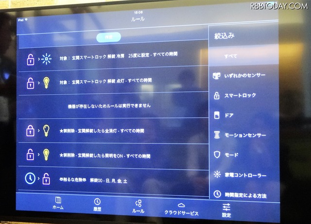 また、利用デバイスの1つである照明やエアコンと連動した高機能リモコン「家電コントローラー」には、9月27日のヴァージョンアップで湿度・温度・照度を検知する環境センサーが追加された。この機能により、アプリ上で確認できる情報に温度などの室内環境情報が加わり、新たに環境変化によって自動的に家電が動くシステム設定が可能になった。