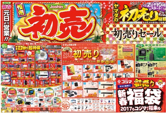 コジマでは、一部店舗を除いて2017年1月1日10時オープン。こちらも、2016年12月31日16時時点において、詳細な内容は明かされていないものの、「新春福袋」の販売が予告されている。なお、コジマビックカメラも元日10時オープン。こちらはすでに初売りの情報が明らかにされており、洗濯機やテレビ、ブルーレイレコーダー、冷蔵庫などがセットになった「豪華絢爛福袋」が998,000円で販売されるほか、1月1日・2日・3日・4日の各日限定で、「新春日替り超特価」商品が台数限定で用意される。例えば、1日にはTOSHIBAの32型ハイビジョンテレビREGZA(32S10)が31,800円で店頭に並ぶほか、2日はSHARPの洗濯乾燥機(ESTX950N)が79,800円、3日はORIONの32型ハイビジョンテレビ(BN32DT10H)が22,800円、4日はTOSHIBAのブルーレイレコーダーREGZA(DBRE507)が26,800円で販売される。他にも、多数のお買い得商品がラインナップされている。