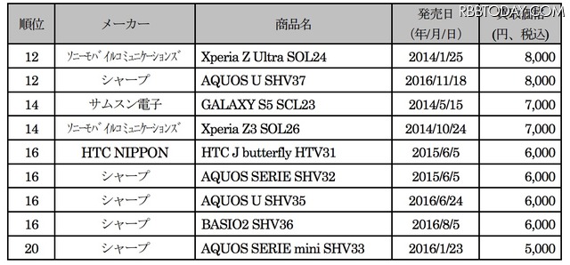 ほかにも、シャープ製の「AQUOS」が5機種ランクインしており、ソニーモバイルコミュニケーションズ、サムスン電子とあわせて3ブランドが圧倒的な強さをみせている。さらに、同ランキングのドコモ版には登場しなかったHTC NIPPONが取り扱う「HTC 10」「HTC J butterfly」がランクインしている点も特徴だ。発売日別に見ると、2016年の商品が9機種、2015年が7機種、2014年が4機種がランクインしている。