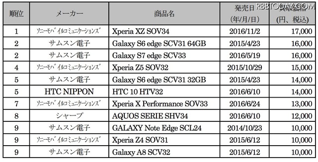ゲオ・ホールディングスは30日、「au 中古スマートフォン買取価格ランキング/Android 部門」(同日時点)を発表した。